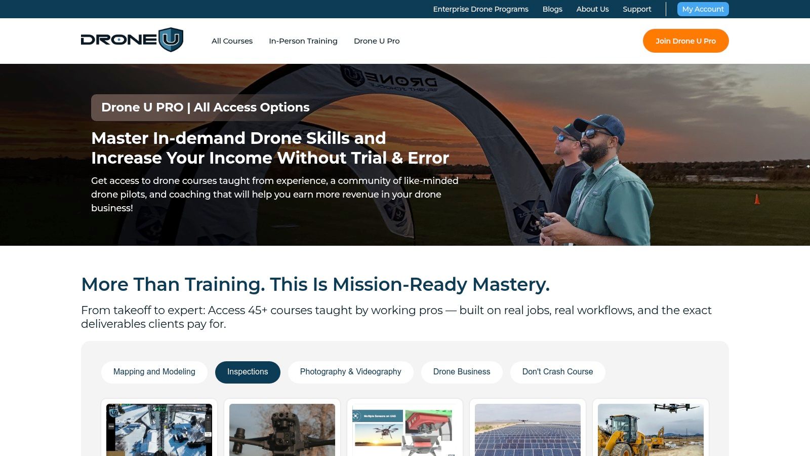 Drone U takes a different approach by offering an all-access membership instead of a single course. This subscription model is ideal for pilots who want to go beyond aerial photography and explore the full business potential of drones, including mapping, inspections, and videography. With a library of over 45 courses, Drone U positions itself as a comprehensive resource for continuous, long-term learning and professional development.